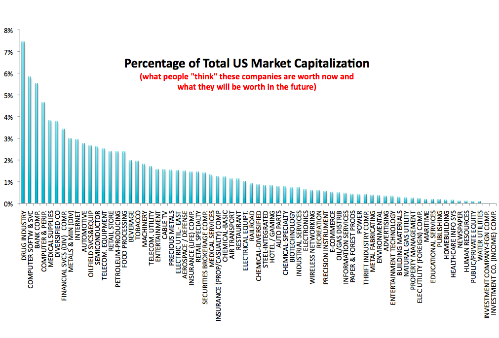 - Largest market capitalization, percentage-wise, is found in the Drug Industry followed by Software, Banking, and Computers & peripherals.