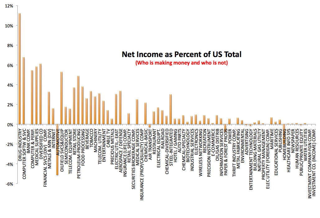 - Net Income, basically how profitable they are. As would be expected from looking at the market capitalization graph, the Drug Industry followed by the Software industry are the most profitable. Thus investor's assumptions and actual results are in sync here. Most interesting is the Automotive sector. It is the sector with the largest input into the economy is the most unprofitable of any in the US. Homebuilding though far down in expectations from investors and influence on the economy, it is the second largest in losses. Obviously this is due to the bust of the housing bubble.